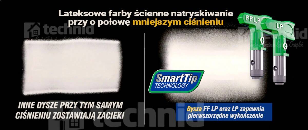 • Zgłoszona do opatentowania technologia SmartTip to końcówki o wyjątkowej geometrii wewnętrznej dostępnej wyłącznie w firmie Graco, które pozwalają na zmniejszenie energii koniecznej do rozpylania wybranych przez użytkownika farb, bejc i innych materiałów — doskonałe wykończenie gwarantowane przy jeszcze niższym ciśnieniu